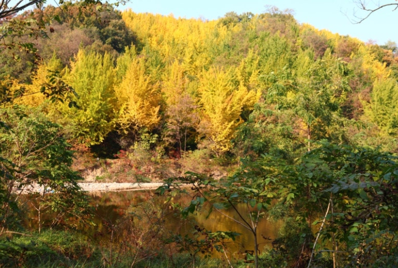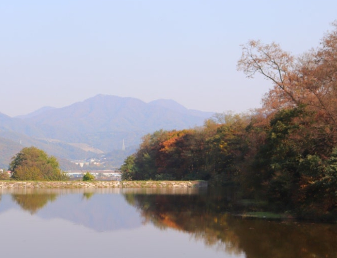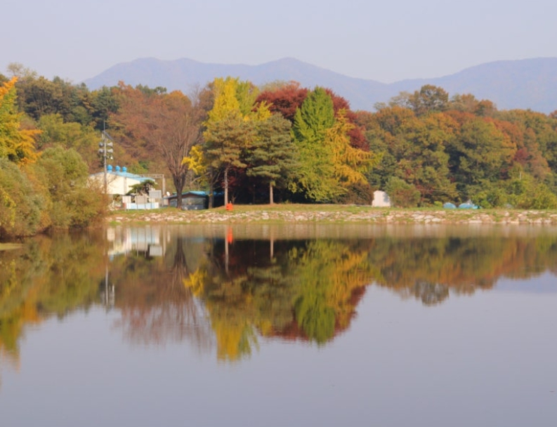 단풍길 사이를 따라 걸어가면 조용한 시골 풍경이 펼쳐지며 제방이 나타나는데 제방을 따라 걷다 보면 만나게 되는 물에 비친 단풍은 멋진 그림 같은 풍경을 보여줍니다.