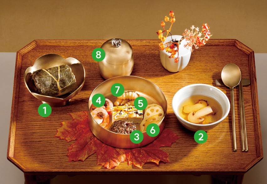 - 연잎밥 : 연잎에 참쌀과 대추, 밤 등의 다양한 곡식을 넣어 쪄낸 음식입니다.