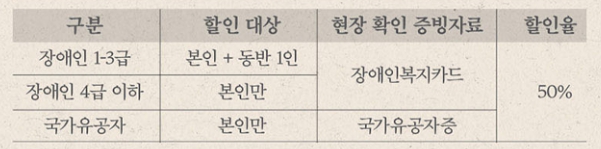 ※ 할인은 예매 시 적용할 수 있으며, 일반 권종으로 예매 후 현장에서 할인 적용(차액환불)이 불가합니다.