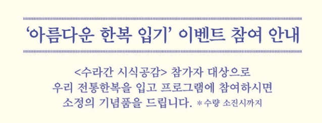 ※ 수라간 시식공감은 야간에 진행되는 행사로 미취학 아동은 안전상의 이유로 참여가 불가하며 취학아동 및 청소년은 반드시 보호자와 함께 입장해야 합니다.