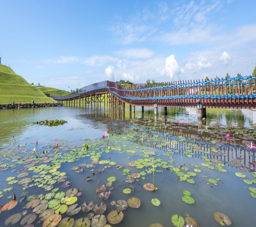 ● 호수정원 : 세계적인 정원 디자이너인 영국의 찰스 젱스가 디자인한 공간으로 박람회장의 중심 공간입니다. 순천의 지형과 물의 흐름을 잘 살린 디자인으로 산과 호수가 원래부터 있었던 것처럼 자연스러운 형태로 구성되어 있으며, 공원 중심에는 봉화언덕이 있고 난봉언덕, 인제언덕, 해룡언덕, 앵무언덕, 순천만언덕이 호수정원을 둘러싸고 있습니다. 호수는 순천의 도심을 나타내고 호수를 가로지르고 있는 데크는 순천시의 젖줄 동천을 형상화한 것입니다