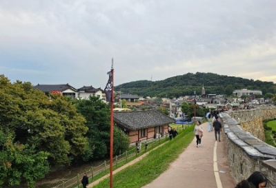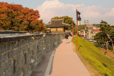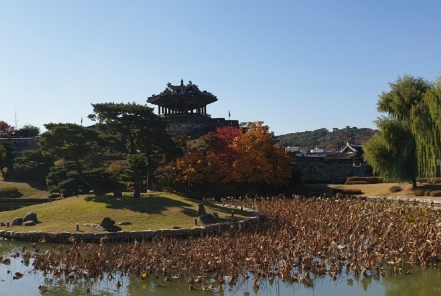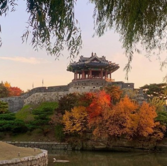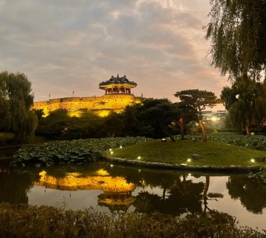 수원 방화수류정은 성곽과 연못이 동화 같은 분위기를 형성하며 잔디밭에서 돗자리를 펴고 가을 피크닉을 즐기기에는 최고의 장소입니다. 특히 밤이면 성곽을 따라 조명이 들어와 낮과는 다른 풍경을 만나볼 수 있습니다.