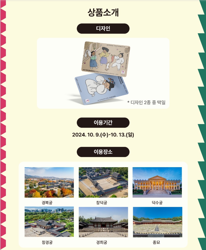 2024년 가을 궁중문화축전기간 동안 서울의 55대 궁과 종묘를 무제한으로 방문할 수 있는 특별관람권입니다.