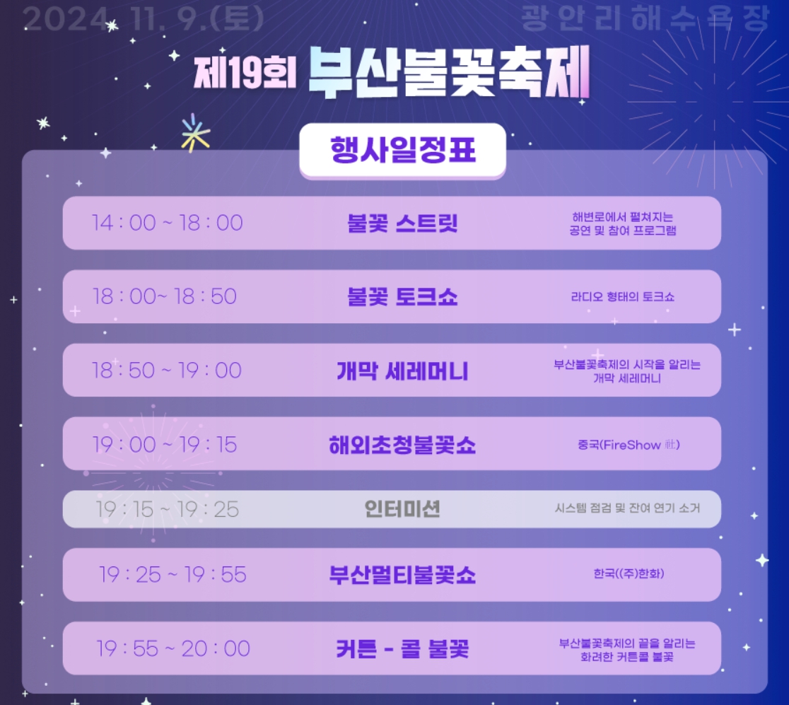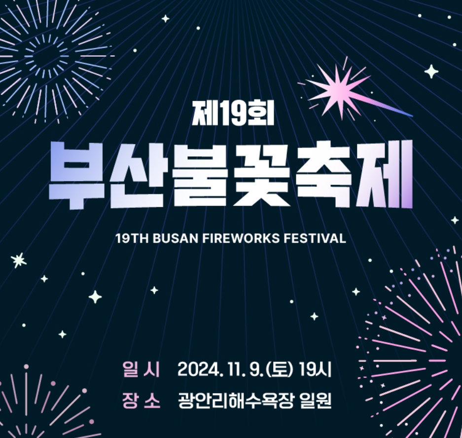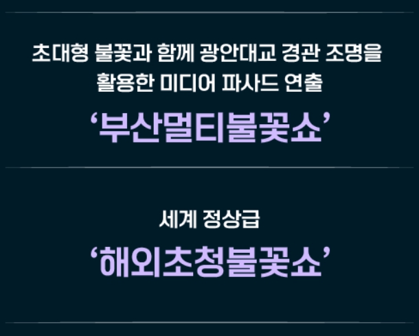 - 부산멀티 불꽃쇼 : 광안리, 이기대, 동백섬에서 펼쳐지는 광안대교를 활용한 부산 불꽃 축제만의 특색 있는 부산 멀티 불꽃쇼