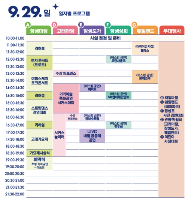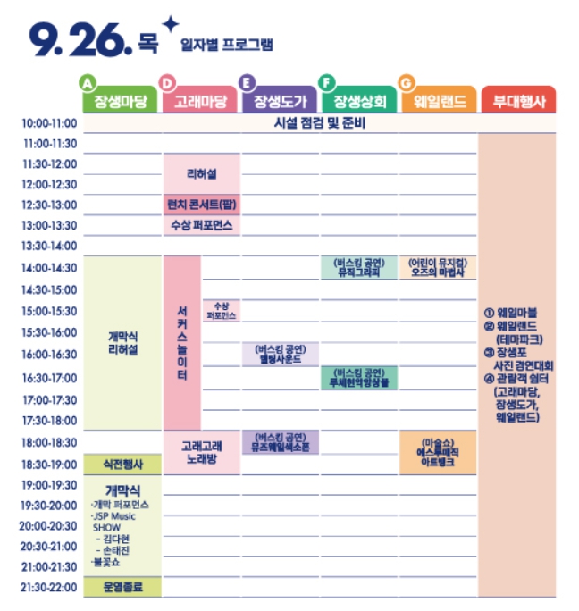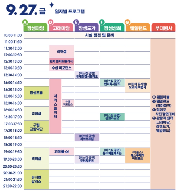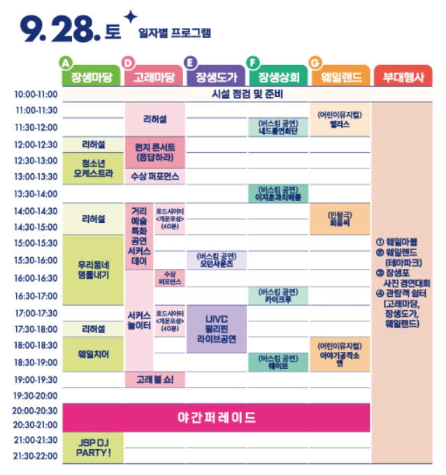 - 먹거리 : 장생식당(메인 음식부스), 장생주막(막걸리존) 푸드트럭 등