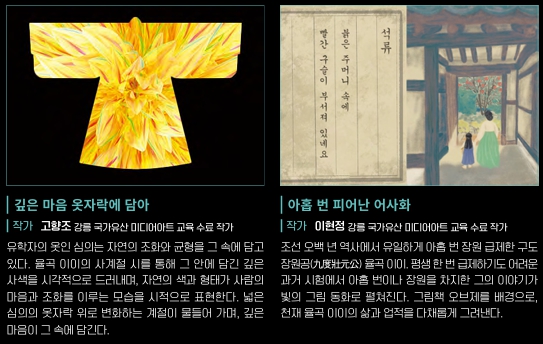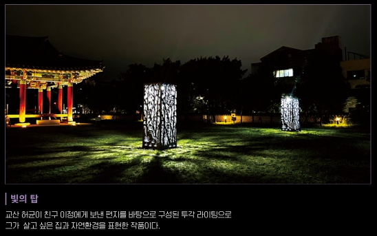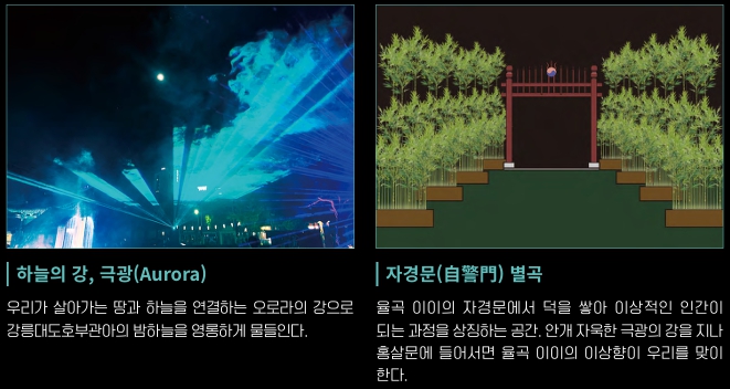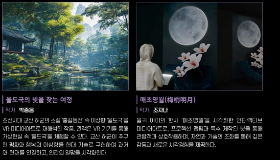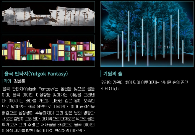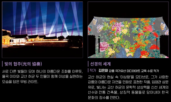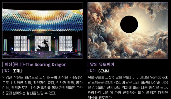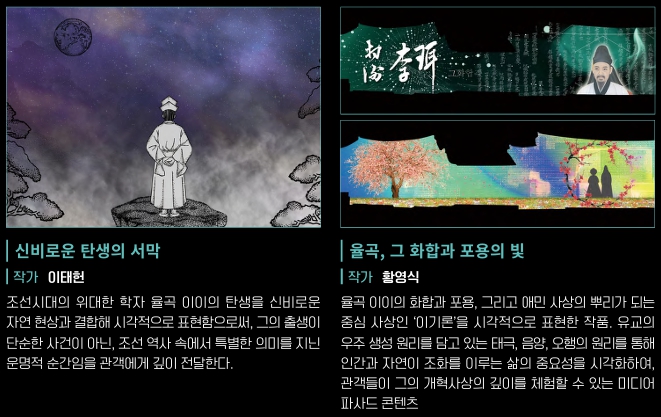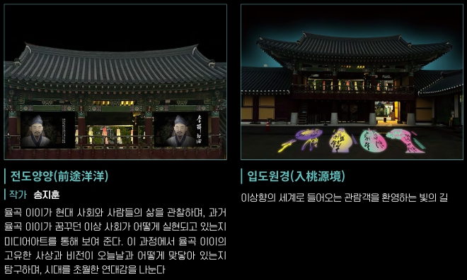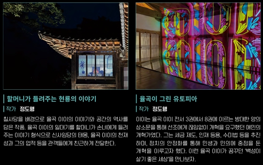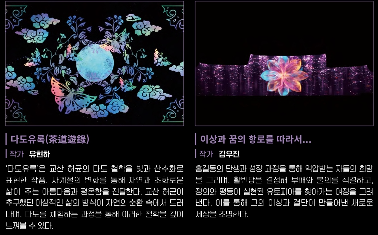 시공간을 초월한 개혁주의 사상가 율곡이와 파란만장한 삶을 살았던 혁명가 교산 허균의 세계를 빛으로 만나는 유토피아라는 주제로 시공간을 초월한 미디어아트로 재조명합니다.