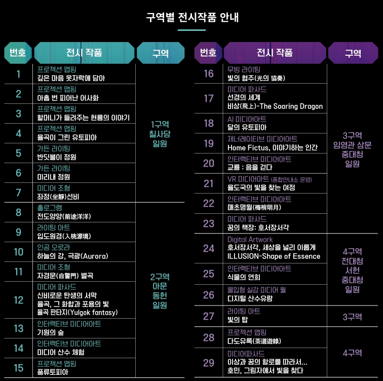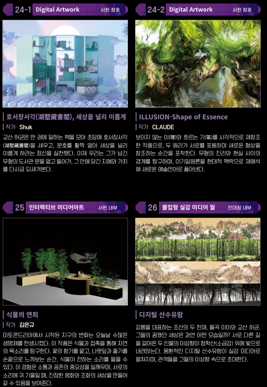 시민들이 쉽게 감상할 수 있도록 미술관에 가지 않고도 문화유산과 디지털아트를 결합한 관람형 콘텐츠로 구성되어 있습니다. 즐길거리. 체험과 교육이 수반되는 인터랙티브 미디어아트 전시로, 관람객의 체험과 참여 형식으로 창의적인 아름다움을 지닌 미디어아트를 보여줍니다.