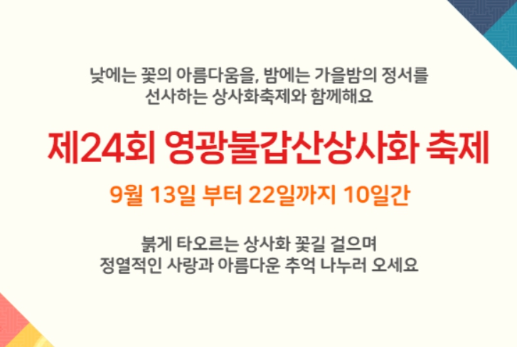 제24회 영광 불갑산 상사화축제는 ‘상사화 빛에 물들GO, 영광에 머물古’를 주제로 9월 13일부터 22일까지 10일간 열립니다. 온 산을 붉게 수놓은 상사화와 함께 하는 꽃길 걷기, 상사화 소원의 길,, 상사화 미디어파사드, 상사화 달빛 야행 등의 대표 프로그램과 상사화를 테마로 한 다양한 경연, 공연, 체험, 전시행사가 펼쳐집니다. 올해는 온오프라인을 연계한 프로그램 개발, 다회용기 사용을 통한 친환경 축제, 상사화 아카이빙을 통한 추억 되새기기, 영광군 관광지와 연계한 이벤트 강화, 편의시설 확대 등 더욱 새롭게 여행객을 맞이할 계획이라고 합니다.