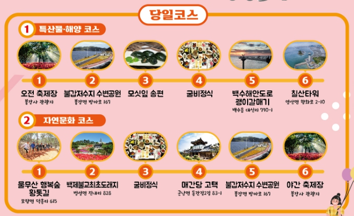 축제장 방문과 함께 당일코스, 1박2일코스 중 하나의 여행코스를 완주하고 영수증 또는 인증샷을 상사화 축제 홈페이지로 보내면 선착순 100명에게 소정의 기념품(20,000원 상당 모싯잎 송편)을 제공합니다