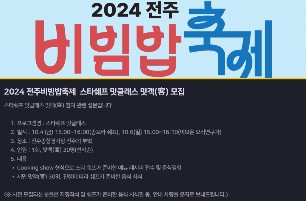 전주 음식 명인, 명가, 명소 및 유명셰프 초청하여 음식을 만드는 과정과 셰프가 준비한 음식을 먹어볼 수 있습니다.