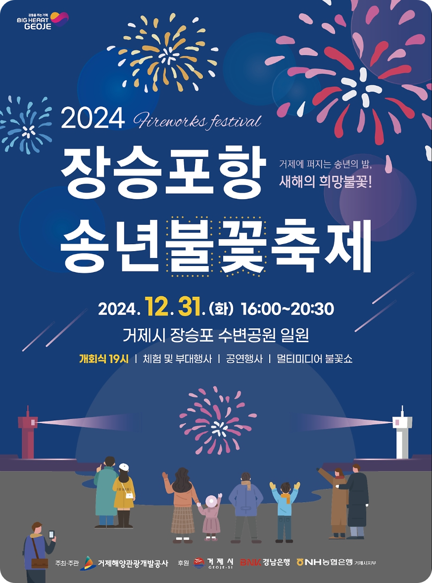 매년 12월 31일 개최되는 거제시의 대표적인 불꽃 축제 행사로, 화려한 멀티미디어 불꽃쇼와 더불어 지역 문화예술 공연과 체험부스, 차 없는 불꽃거리가 어우러져 거제 장승포항의 아름다운 송년 밤바다 분위기를 느낄 수 있습니다.