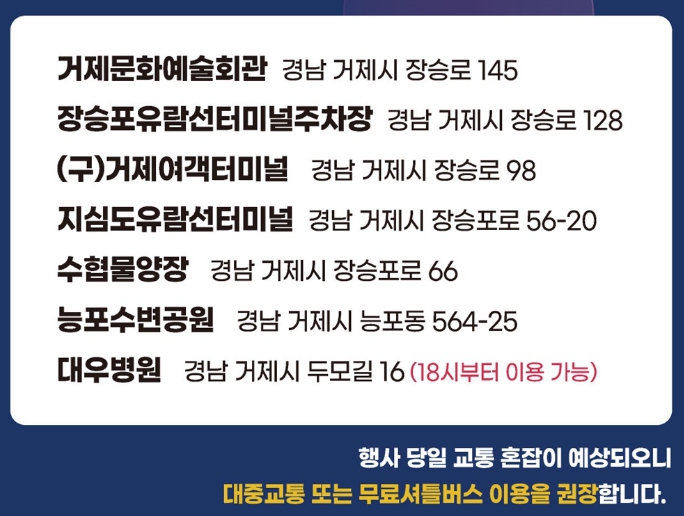 - 차 없는 거리 운영 : 10:00 ~ 종료 때까지 : GS25 장승포항구점 > 장승포동 주민센터 앞 > 부일횟집 > 투어하우스(모든차량)