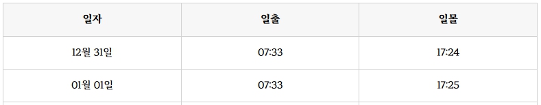 - 12월 31일 일몰시간 : 17:24 / 1월 1일 일출시간 : 17:25