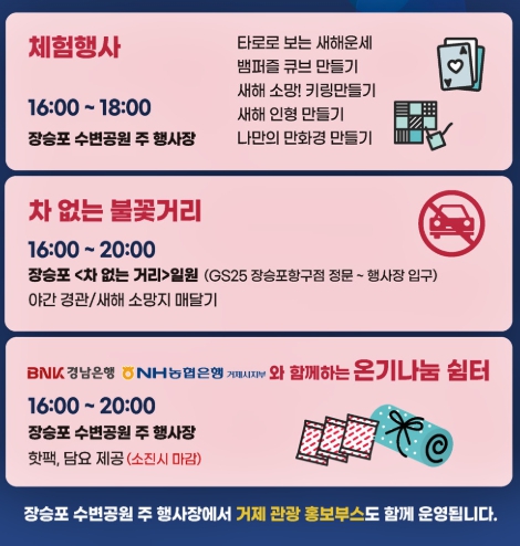 ♣ 12월 31일 장승포항 송년 불꽃축제에서는 불꽃쇼와 함께 다양한 체험행사와 공연도 즐길 수 있습니다. 타로 새해 운세와 뱀퍼즐 큐브 만들기, 새해 소망 키링만들기, 새해 인형 만들기, 나만의 만화경 만들기 등이 진행됩니다.