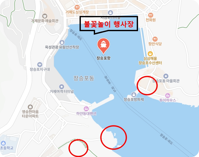 - 장승포 주공아파트 뒷산과 장승포에서 옥림 넘어가는 산책로, 장승포 방파제와 삼삼 해물 주차장은 행사장과 거리는 있지만 사람들이 많이 않고 지대가 높아 불꽃놀이를 한눈에 볼 수있는 위치입니다.