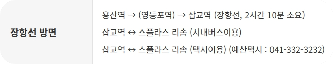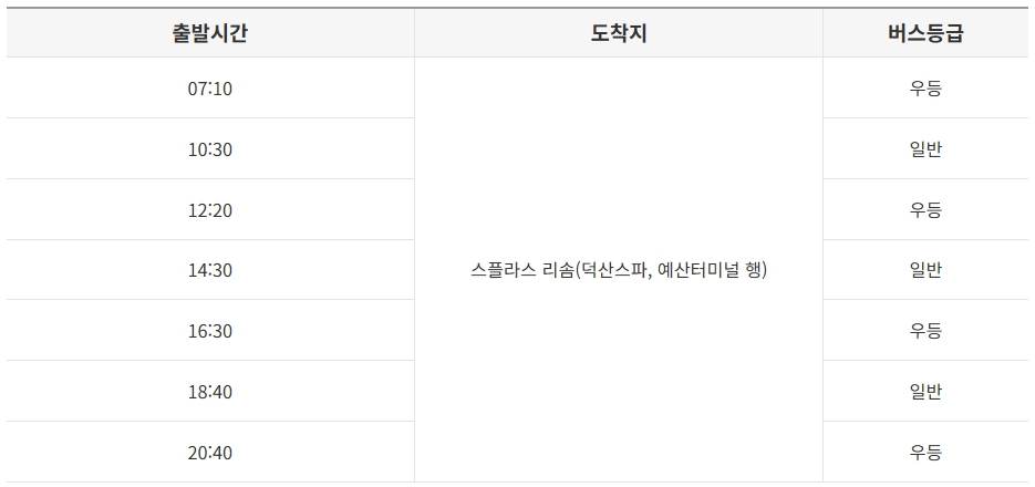 - 고속버스 : 고속버스터미널에서 스플라스 리솜 직행버스도 운영합니다.(1시간 30분 소요)