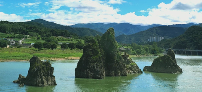 정선에서 떠내려왔다는 것은 정도전의 총명함을 증명하기 위해 후세 사람들이 지어낸 이야기일 듯한데, 단양 도담삼봉은 도대체 어떻게 만들어진 것일지 궁금해지는 부분입니다. 단양 도담삼봉은 강 가운데까지 내려온 산줄기가 남한강과 매포천에서 흐르는 물에 의해 수억 년 동안 녹으면서 200만 년 전에 형성되는데, 유독 봉우리 세 개만이 남게 된 이유는 물에 잘 녹지 않는 ’돌로마이트‘라는 성분이 포함되어 있기 때문이다. 단양 도담삼봉은 충청권 최초로 국가지질공원 중 한 곳으로 지정되어 있습니다. 도담삼봉을 바라보며 오른쪽 산에 정자가 있는데 1985년 충주댐 완공으로 도담삼봉 앞에 있던 마을이 이주하게 되는데, 이를 기억하기 위해 300여 세대가 돈을 모아 정자를 짓게 되는데 이곳이 ‘이향정’입니다. 이곳에서 가상의 선을 그려보면 원래 산줄기를 상상해 볼 수 있습니다.