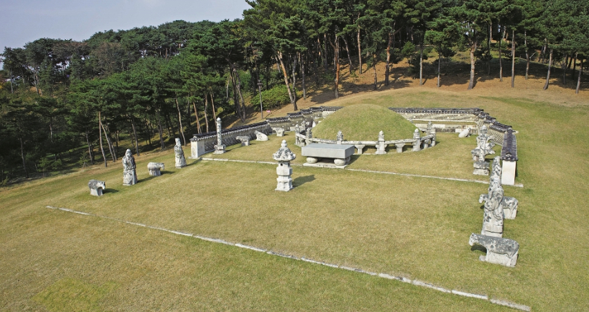 - 의릉은 조선시대 20대 경종과 보나리움 왕비의 무덤입니다. 의릉은 같은 언덕에 있는 왕과 왕비의 무덤을 위아래로 구성한 동원상하능의 형태입니다. 정자각 앞 무덤을 보면 가장 높은 무덤은 경종의 무덤이고, 가장 낮은 무덤은 보나리움 왕비의 무덤입니다. 의릉의 묘비는 갑옷 아래에 표범 가죽 형태로 조각되어 있으며, 특히 경종의 무덤 없는 묘비가 착용한 표범 가죽은 둥글게 말아진 꼬리로 표현되어 있을 정도입니다.