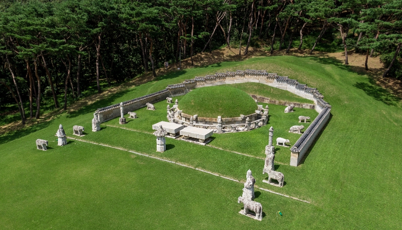 - 강릉은 조선 제13대 명종과 인순왕후 심씨의 무덤입니다. 강릉은 하나의 곡물밭에 무덤이 나란히 배열된 쌍릉(雙陵)의 한 형태로, 정면에서 무덤을 보면 왼쪽(서쪽)은 명종, 오른쪽(동쪽)은 인순왕후의 무덤입니다. 문정왕후의 무덤이 조성된 지 2년 만에 조성된 무덤이기 때문에 전체적으로 무덤과 비슷해 보입니다. 두 무덤 위에는 접이식 돌과 난간석이 둘러쳐져 있었고, 두 무덤은 난간석으로 연결되어 있었습니다.