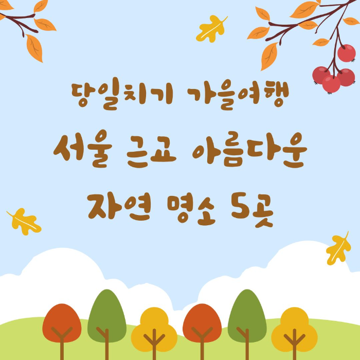 올해 10월은 징검다리 연휴가 많은 달입니다. 월차 연차를 사용해 며칠씩 날을 잡아 여행을 떠나는 것도 좋지만 여건이 안 된다면 당일치기로도 가볼 만한 여행지가 많이 있습니다. 이 포스팅에서는 당일치기 가을 여행지로 서울 근교에 아름다운 자연 명소 5곳을 살펴보겠습니다.