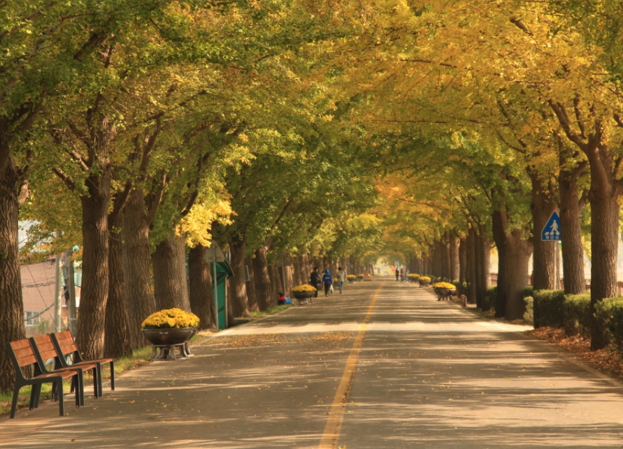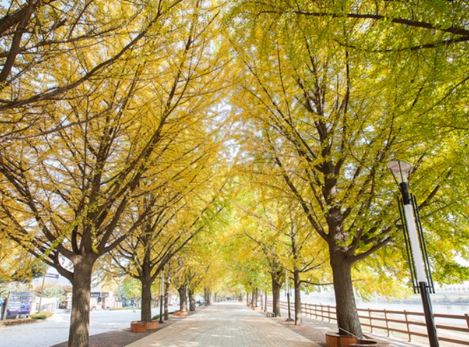 가을철에는 은행나무가 노란빛으로 물들어 평일에도 많은 사람들이 찾으며, 휴일에는 인산인해를 이룹니다. 청명한 가을 하늘을 배경으로 한 노란 은행나무길은 가을 정취를 만끽하고, 사진으로 남기기에 적격입니다.