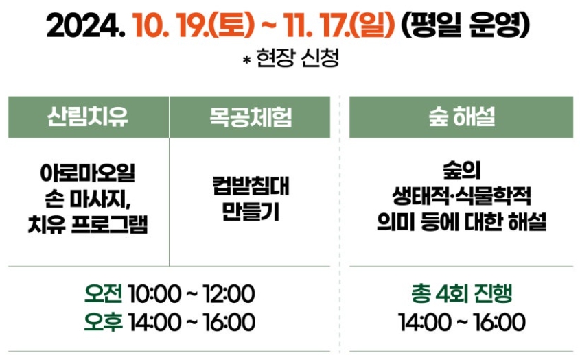 - 산림치유 프로그램: 자연 속에서 심신을 치유할 수 있는 프로그램입니다. (아로마오일 마사지 등)