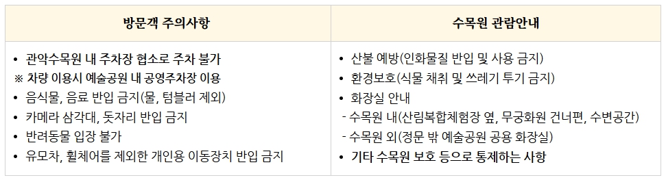 수목원의 보존을 위해 반려동물 입장, 음식물 및 돗자리 반입, 식물 채취, 쓰레기 투기 등은 금지됩니다.