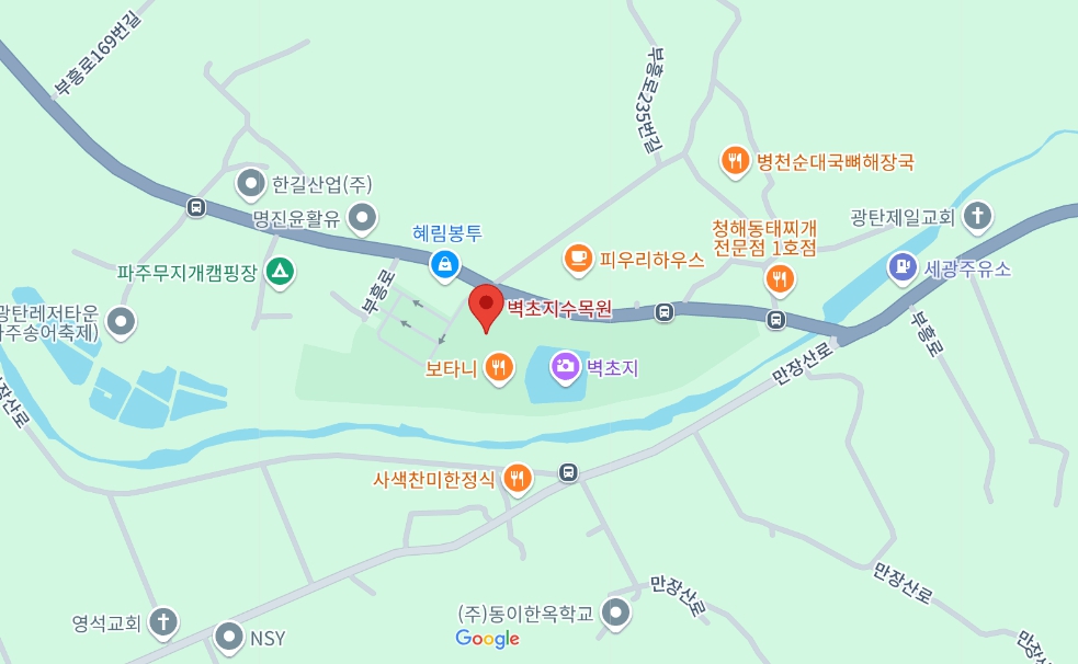 - 경의중앙선 월롱역 하차 > 택시 (뚝방길 이용 약 8000원) > 벽초지수목원
