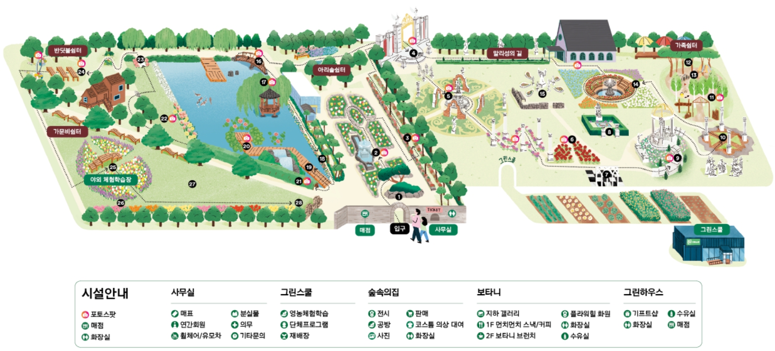 - 하경원 : 시원한 그늘에서 여왕의 정원을 한눈에 관람하고 음지 식물들을 할게 관찰할 수 있는 정원입니다.