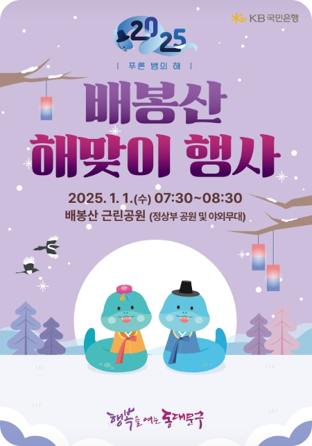 배봉산 해맞이 행사는 배봉산 근린공원에서 새해기념타징과, 새해희망기원 공연, 복떡국 나눔 행사 등이 진행되며 무장애 둘레길과 등산로가 잘 정비되어 있어 편안하게 올라 해돋이를 즐길 수 있는 장소입니다.