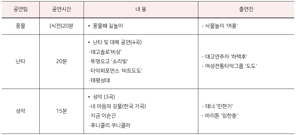 - 공연시간 : 식전 20분 / 풍물패 길놀이 / 사물놀이 ‘여흥’