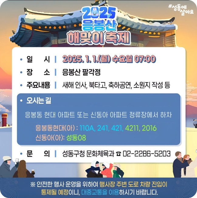 ♣ 행사프로그램 : 풍물패 길놀이, 난타, 성악공연 새해 소원지 달기, 대고각 북치기, 일출 관람 대고각 북치기 등 체험행사가 열립니다.
