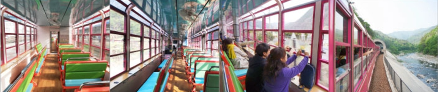 - 분천 > 철암구간 1호차 : 맨 뒤에 있는 1호차의 넓은 통창으로 풍경을 즐길 수 있어서 인기가 많은 객실입니다.