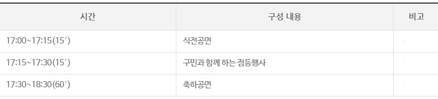 - 2024년 12월 20일(금)부터 12월 31일(월)까지 12일간 평일은 저녁 6시부터, 주말은 5시부터 버스킹공연이 열립니다. 전문 공연팀과 마술쇼, 비보잉, 매직버블, K-pop, 팝핀, 코믹 매직쇼, 저글맨 등의 프로그램을 즐길 수 있습니다.