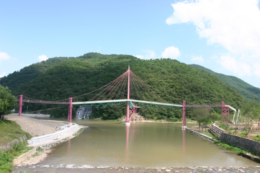 의령에는 의령천의 맑은 물과 함께 잘 조성된 수변공원 위로 우뚝 솟은 구름다리가 마치 한 폭의 그림처럼 아름답게 자리하고 있습니다. 의령 구름다리는 현기증이 날 정도로 높은 곳에 있지만 사방을 둘러보면 주변의 자연경관이 한눈에 들어와서 흡사 전망대에 올라선 것 같은 느낌을 줍니다. 이곳은 자굴산에서 발원하여 흐르는 의령천과 병화산 기슭에서 발원하여 흐르는 남천이 합류되는 삼각지입니다. 구름다리 주탑에서 동쪽으로 남강 정암진 솥바위가 있어 솥바위 반경 30리에서 부자가 난다는 전설이 있는데 우리나라 경제인 가운데 삼성그룹의 호암 이병철, 효성그룹의 만우 조홍제, LG그룹의 연암 구인회 선생이 실세 인물로 있어서 전설이 아니라 사실일지도 모른다는 생각이 들기도 합니다. 이곳 구름다리에서 동쪽 해 뜰 무렵 솥바위쪽을 바라보고 기원하면 아홉 용의 기운을 받아 부자가 된다는 전설이 있는 이곳에 의령군에서 공원화하여 의령 구름다리를 만든 것입니다.