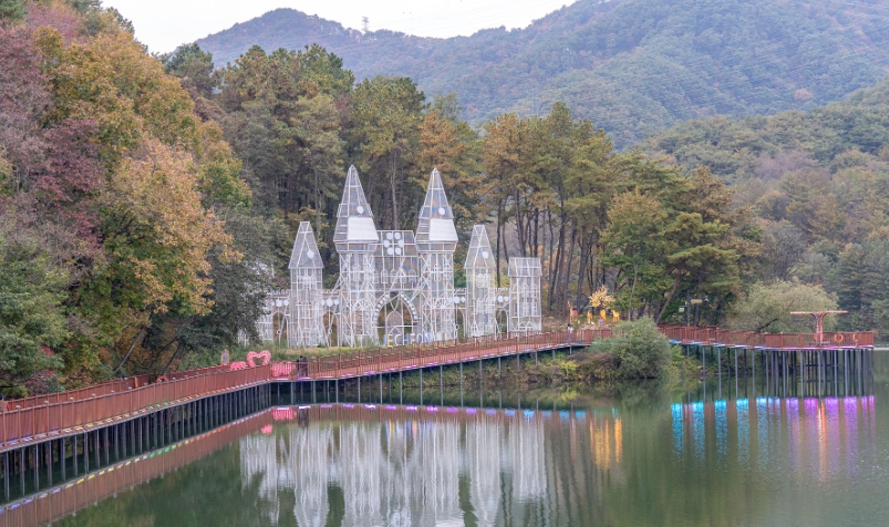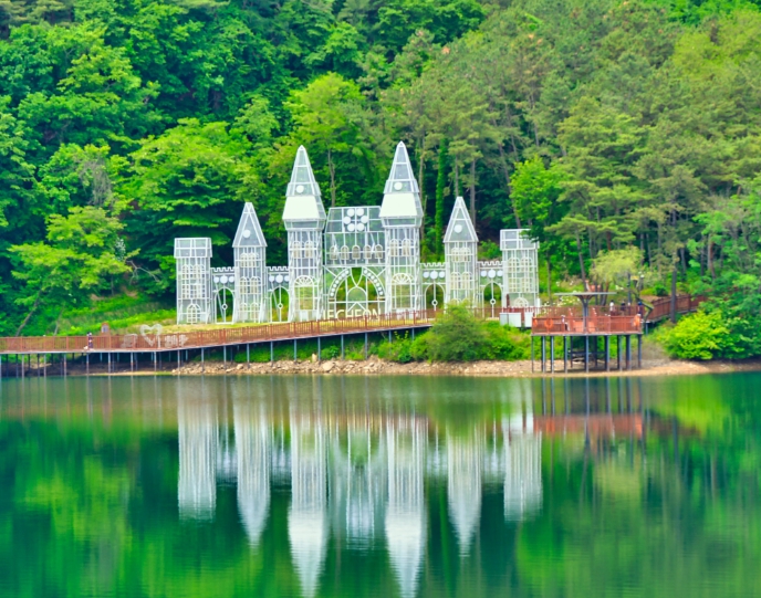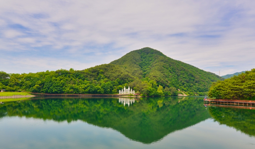 제천 비룡담 저수지는 숲 속에 둘러싸여 있어 마치 비밀의 성과 같은 모습을 하고 있어 '마법의 성'이라고도 불립니다. 이곳은 아름다운 경치와 성 형태의 구조물이 어우러져 마치 유럽에 온 듯한 느낌을 줍니다. 저수지 주변에는 수변데크길이 조성되어 있어 산책을 즐기며 제천의 풍경을 감상할 수 있습니다.
