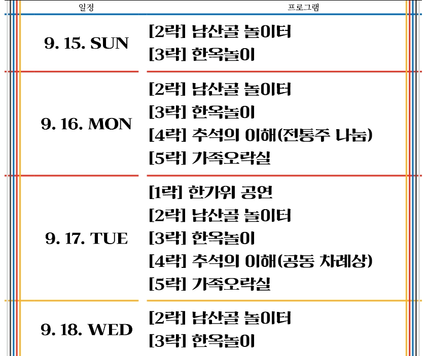 추선연휴에는 지역 곳곳에서 다양한 행사나 축제가 많이 열립니다. 그중 남산골 한옥마을에서 열리는 남산골 한가위축제 일정과 프로그램, 교통편에 대해 정리해 보겠습니다.
