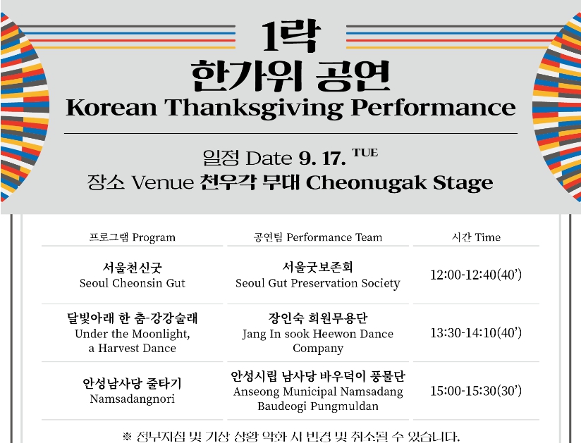 - 서울굿보존회의 2024년 추석 서울천신굿은 전통과 현대가 어우러진 특별한 공연입니다. 관객들이 공연을 통해 부정거리, 불사거리, 큰 거리, 작두거리 등 서울굿의 깊은 의미와 가치를 느끼고, 한가위를 맞이해 굿 문화를 함께 나누는 소중한 시간이 되기를 기대합니다