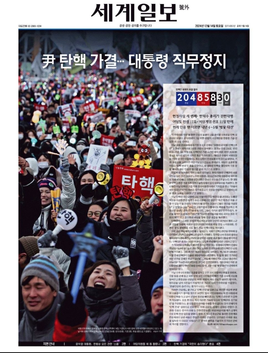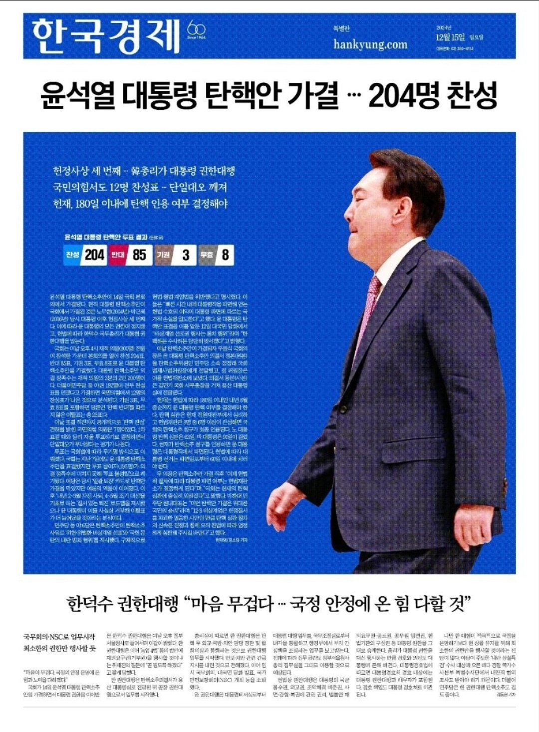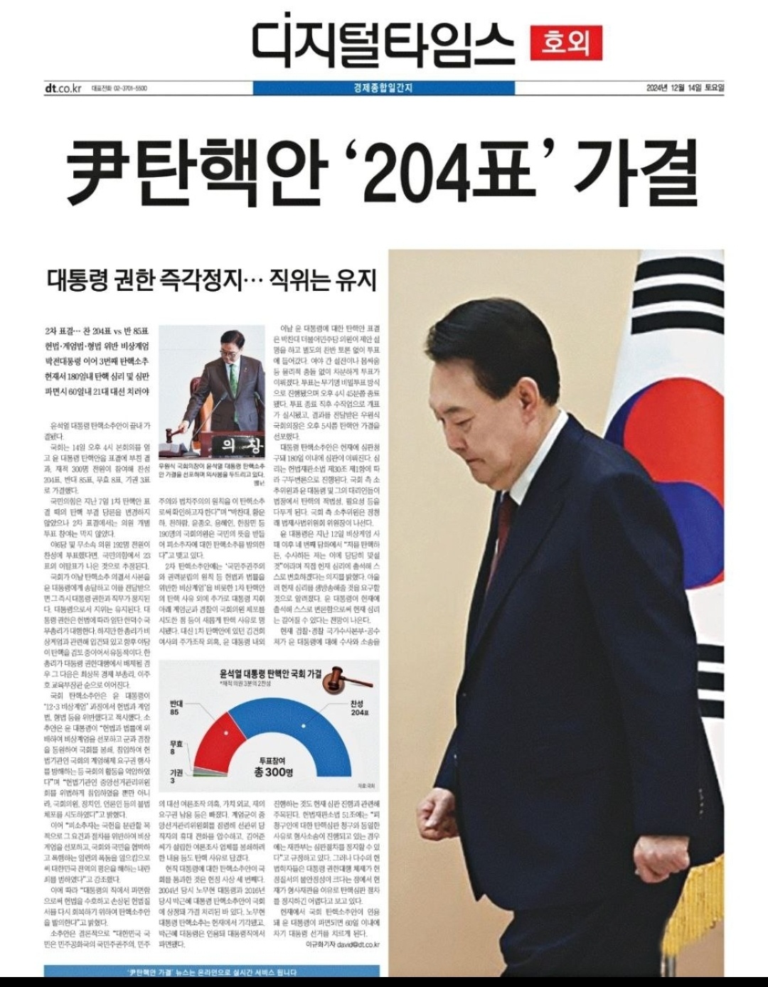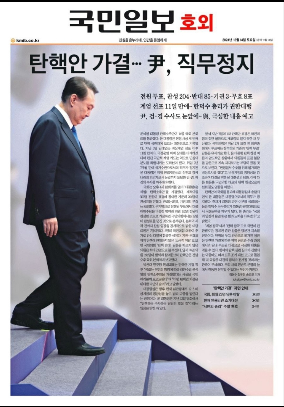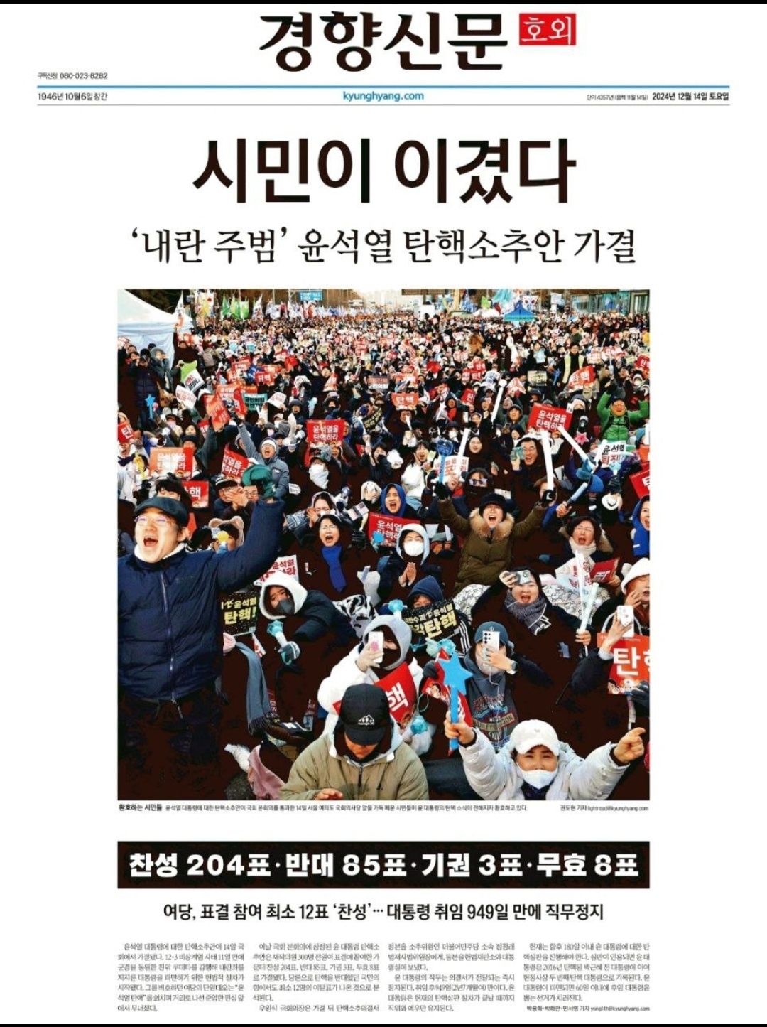12월 14일 오후 5시 <가 204표 / 부 85표 / 기권 3표 / 무효 8표> 탄핵안이 가결되었습니다. 국회의 탄핵소추안 의결서가 대통령실에 전달되어 19시 24분에 업무가 정지되었다고 합니다. 지난주 부결 후 불안한 시간이 일주이나 됐었는데요. 이제 한 고비를 넘긴듯 합니다. 파면 선고가 나올 때까지 최대 6개월이 걸릴 수 있다고 하지만 확실한 죄목이 있기 때문에 그것보다는 빠를 것으로 예상됩니다. 추운 날씨에 차가운 길에서 함께 고생한 대한민국 국민들에게 박수를 보냅니다. 앞으로 탄핵 이후 진행되는 일정들과 언론기사, 탄핵 가결 시 짧은 현장영상을 공유해 보려 합니다.