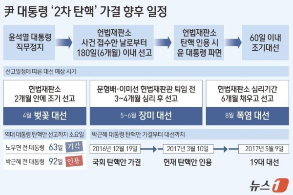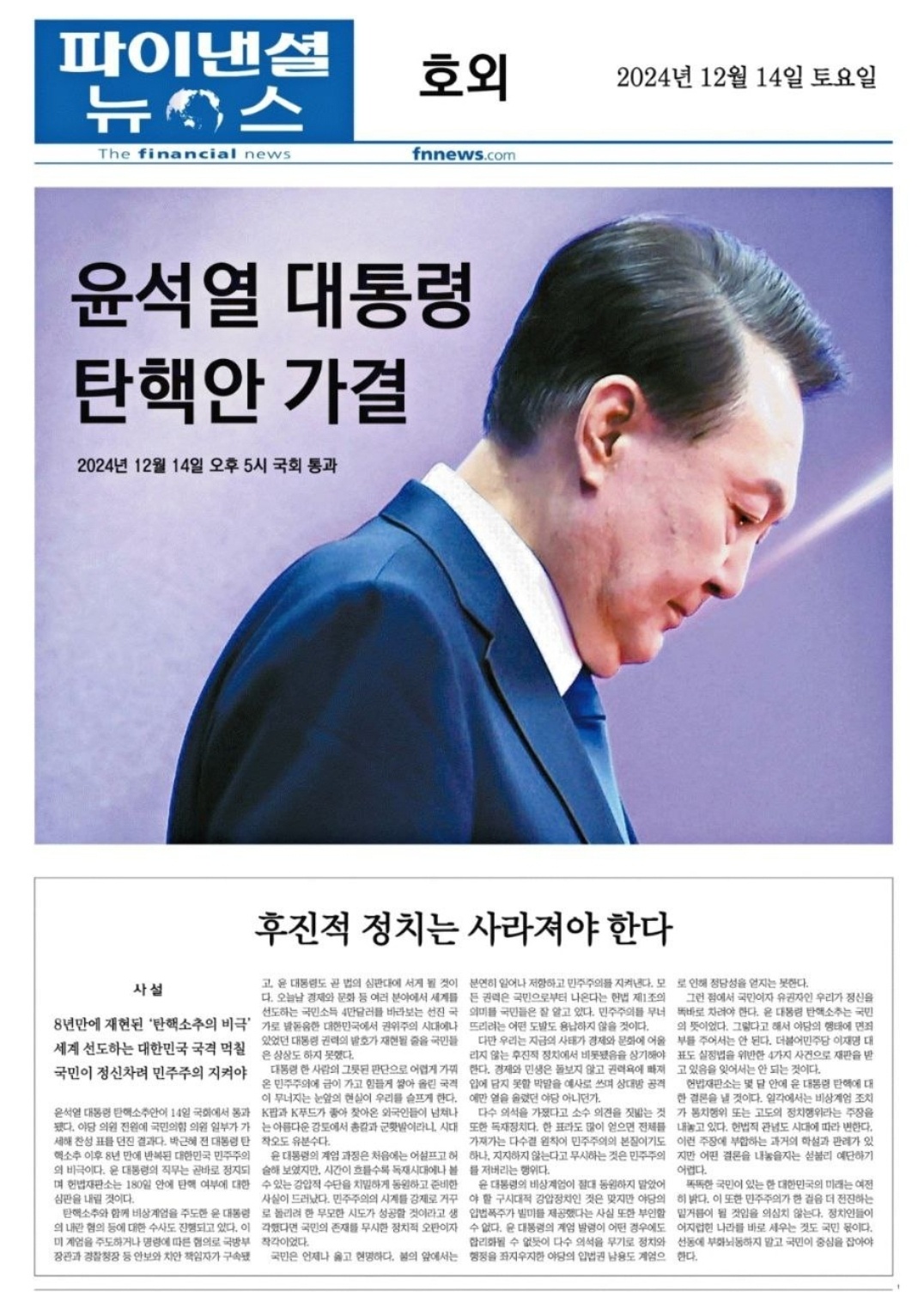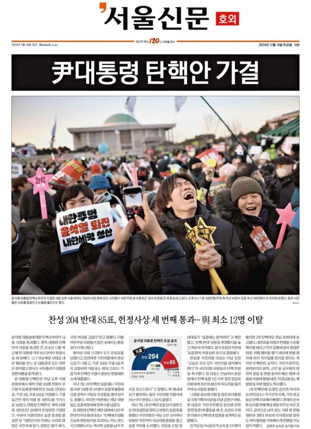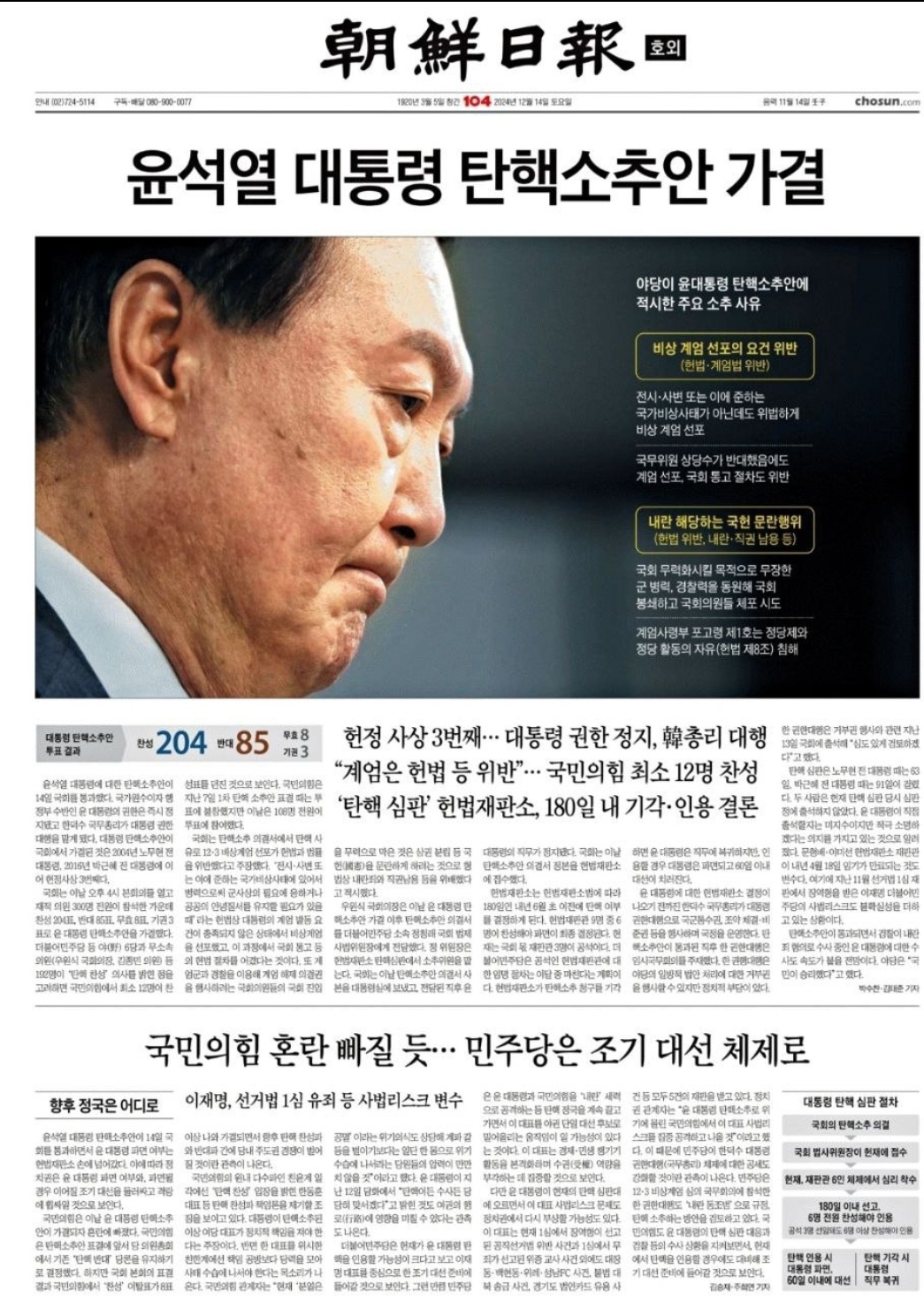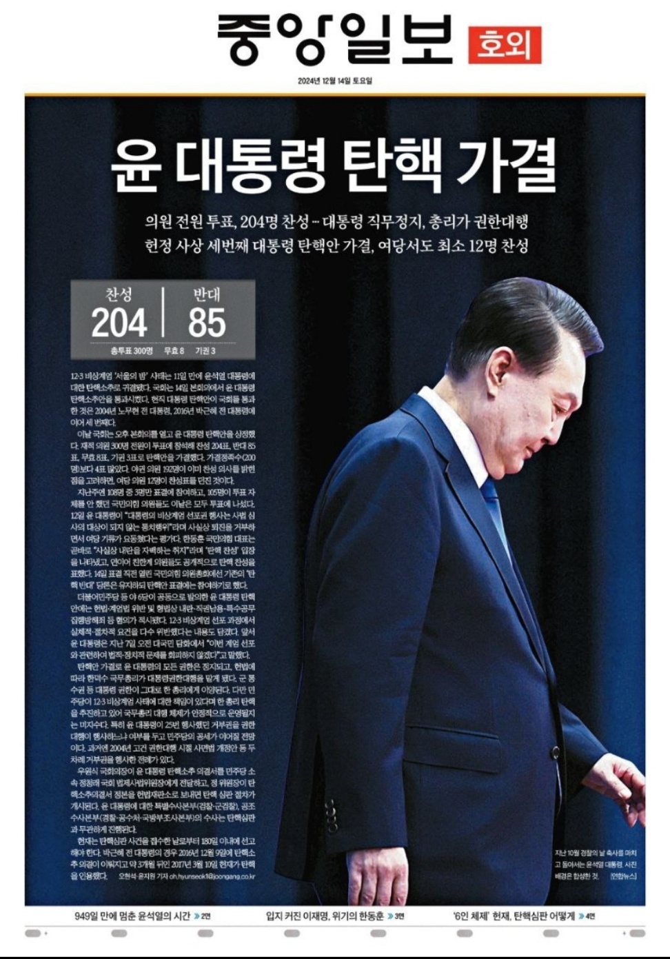 12월 14일 오후 5시 <가 204표 / 부 85표 / 기권 3표 / 무효 8표> 탄핵안이 가결되었습니다. 국회의 탄핵소추안 의결서가 대통령실에 전달되어 19시 24분에 업무가 정지되었다고 합니다. 지난주 부결 후 불안한 시간이 일주이나 됐었는데요. 이제 한 고비를 넘긴듯 합니다. 파면 선고가 나올 때까지 최대 6개월이 걸릴 수 있다고 하지만 확실한 죄목이 있기 때문에 그것보다는 빠를 것으로 예상됩니다. 추운 날씨에 차가운 길에서 함께 고생한 대한민국 국민들에게 박수를 보냅니다. 앞으로 탄핵 이후 진행되는 일정들과 언론기사, 탄핵 가결 시 짧은 현장영상을 공유해 보려 합니다.
