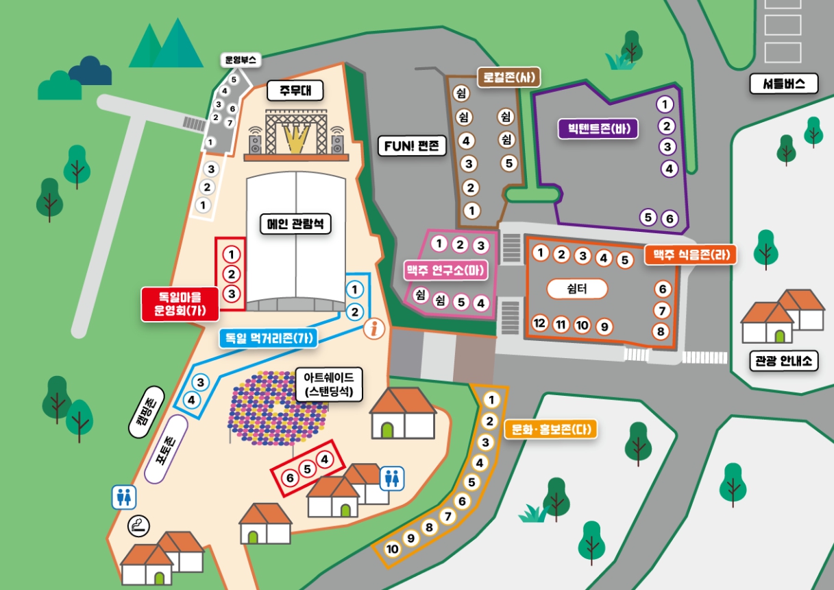 축제의 중심인 도이처플라츠 광장에는 테마존들이 배치되어 메인 무대존, 아트그늘막존(스탠딩석), 인문학 캠핑존, 먹거리존, 포토존이 마련될 예정입니다.