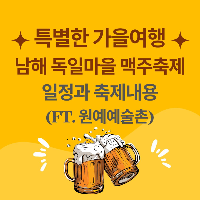 가을이 되면 남해에서 특별한 가을 축제가 열립니다. 독일 뮌헨 옥토버페스트를 모태로 열리는 남해 독일마을 맥주축제는 특별한 가을여행을 계획한다면 꼭 한번 가볼 만한 곳입니다. 이번 포스팅에서 남해 독일마을 맥주축제 일정과 축제내용을 정리해 보겠습니다.