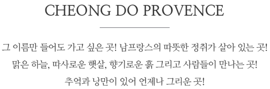 투명한 햇살 아래 무르익은 포도, 광활하게 펼쳐진 보랏빛 라벤더, 풍요로운 대자연 속에 독특한 문화와 예술이 살아 있는 프랑스 남동부 지역의 프로방스마을, 고흐, 세잔, 샤갈, 마티스 등이 사랑한 프랑스 프로방스 마을을 청도에 그대로 재현하여 낮에는 100여 가지 다양한 포토존과 아기자기한 소품, 예쁜 집들이 여행객을 맞이하고 어둠이 내리면 눈부시게 빛나는 빛 축제로 변신하는 곳입니다. 겨울에는 아름다운 빛축제와 산타포토존의 콜라보 컨셉으로 축제가 열려 산타클로스, 루돌프 사슴, 산타요정을 만날 수 있습니다.