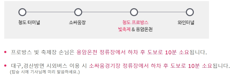 청도역 하차 > 7번(소라, 무등, 용암온천) > 삼신1리 정류장 하차 > 도보 약 10분