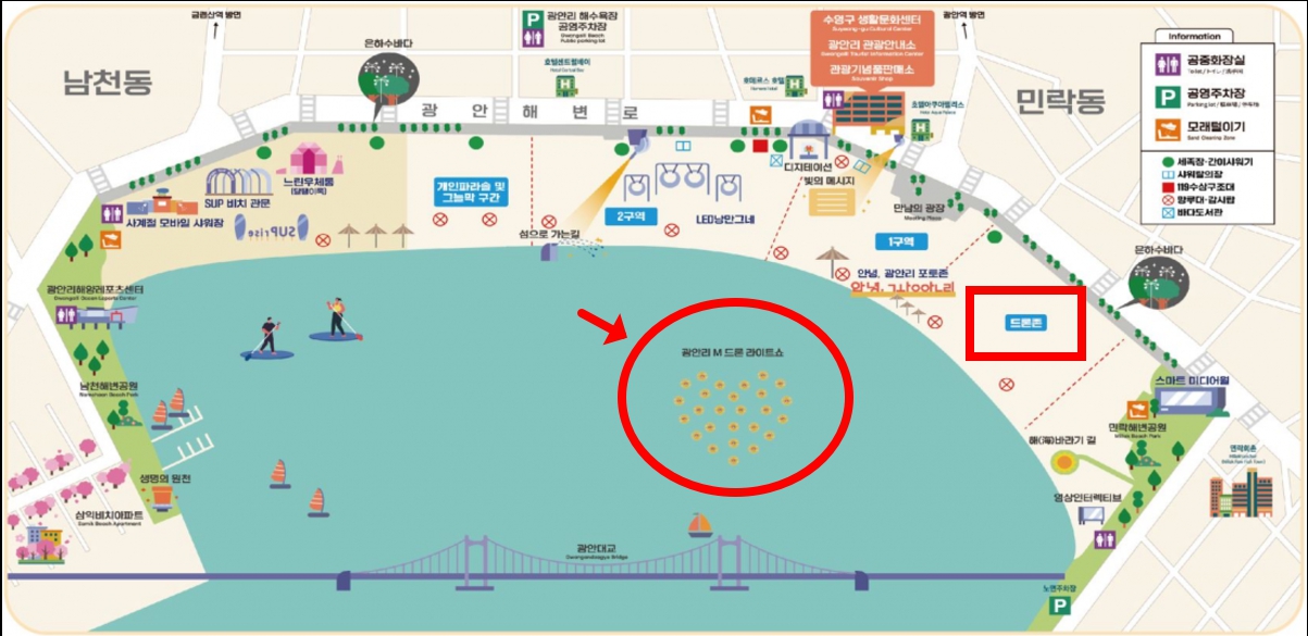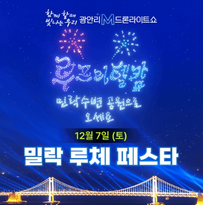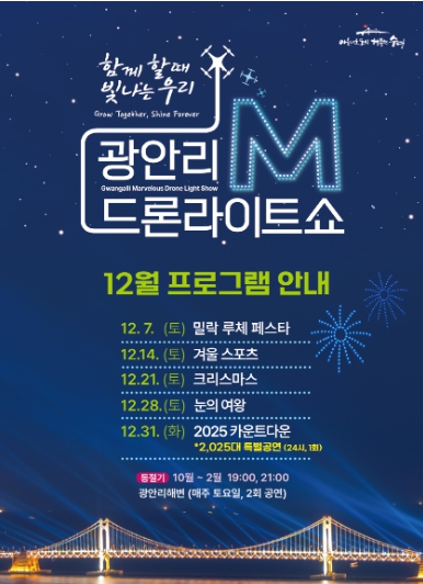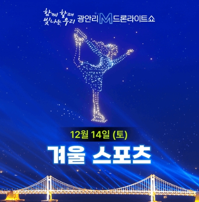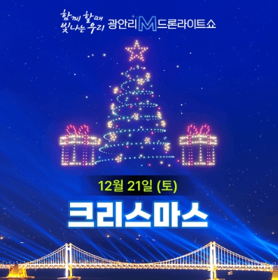 매주 토요일 저녁 광안리에서 펼쳐지는 무료공연으로 다채롭고 새로운 콘테츠와 시민참여 프로젝트입니다. 트렌드를 넘어 세계가 주목하는 메가 트렌드의 중심이 된 광안리 M 드론라이트쇼는 매주 토요일 저녁 2회 진행되며 회당 10분가량의 드론쇼를 광안리해변 어디서나 관람이 가능합니다. 매주 새로운 스토리와 다양한 주제로 아름다운 광안대교와 어우러지는 공연을 선보입니다. 드론쇼 보기 좋은 위치는 광안리해변 정면쪽을 추천하며 사람이 많이 모이는 자리기 때문에 공연시간 전 미리 자리를 잡아두기를 추천합니다. 많이들 추천하는 명당 위치는 광안리 스타벅스 앞이라고 합니다.