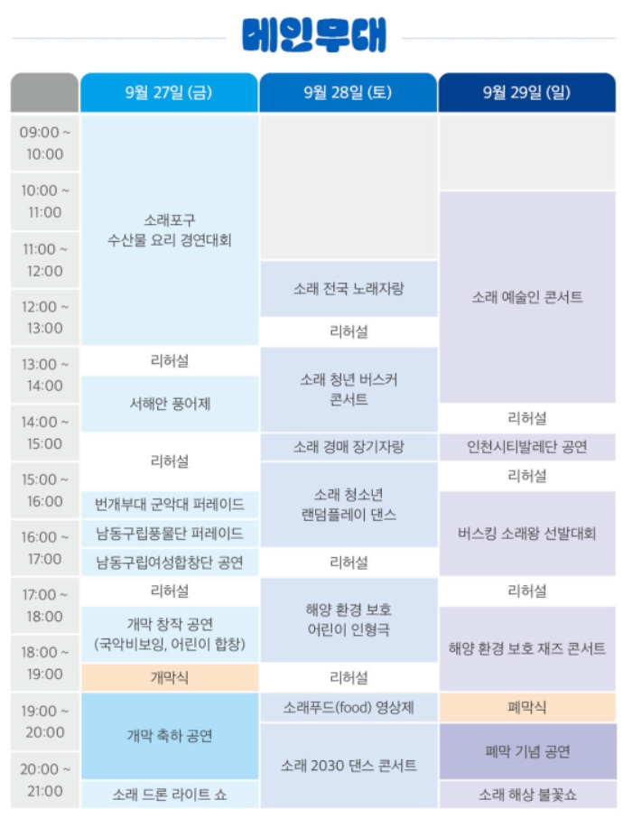 - 셋째 날 : 남동구 예술인이 참여하는 소래 예술인 콘서트와 전국 각지 버스커가 참여하는 버스킹 소래왕 선발대회, 색다른 악기를 활용해 바다 모호 메시지를 전달하는 해양 환경 보호 재즈 콘서트 등으로 진행됩니다.