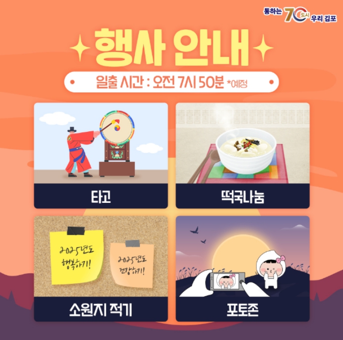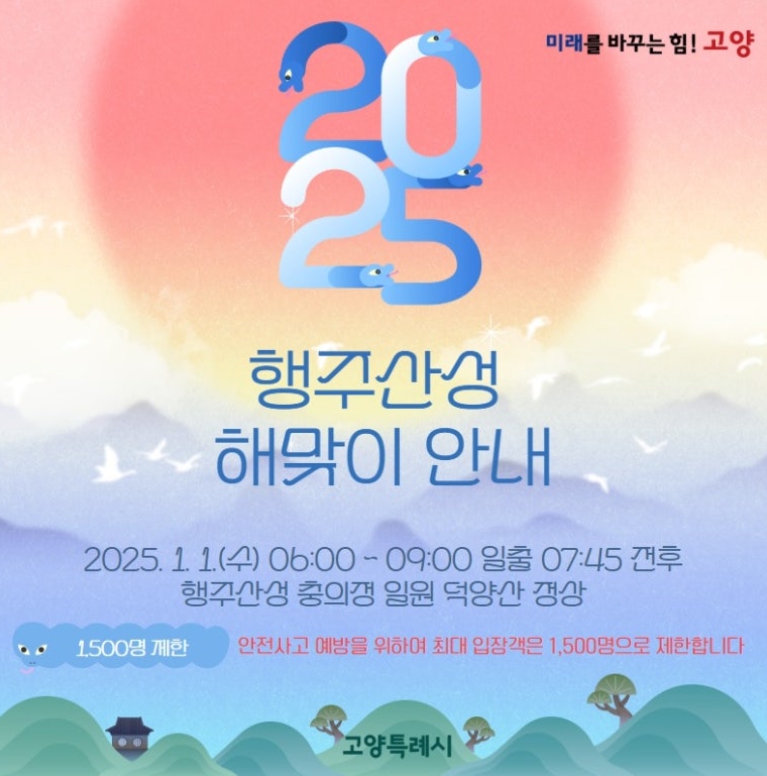 - 부대행사로 방한용품과 먹거리 나눔과 시민들이 참여할 수 있는 새해 소망을 적어 보는 프로그램, 해맞이 인증샷을 남길 수 있는 2025년 뱀의 해를 상징하는 10m 높이의 조형물 등을 즐길 수 있습니다.