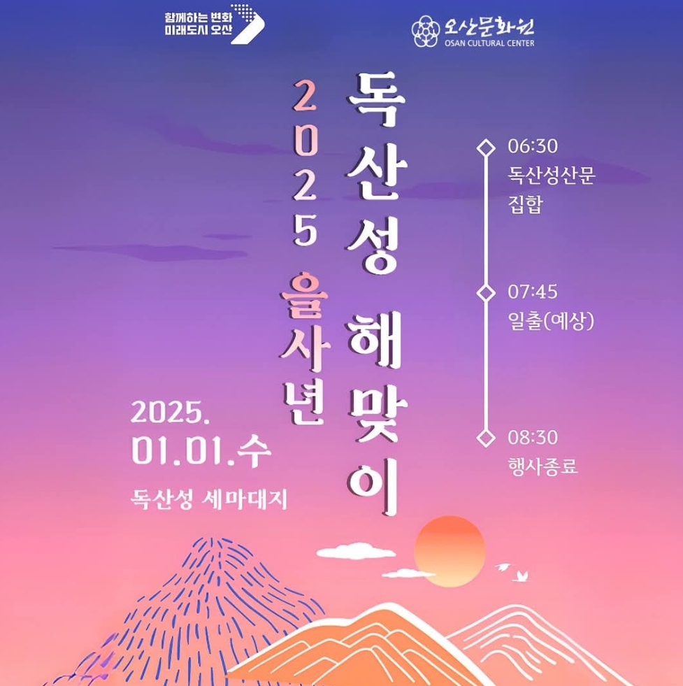 2025년 독산성 새해 해맞이 행사는 지난해 탄소제로를 주제로 환경친화적인 방식으로 진행된 것을 이어 행사가 진행될 예정이라고 합니다. 오권재 오산시장이 26일 SNS통해 오산 독산성 세마대지에서 2025년 떠오르는 첫해를 함께 맞이하며 새로운 희망과 다짐을 나누는 특별한 시간을 가져 보시라며 가족, 친구 이웃과 함께 따뜻한 마음을 나누며 새해의 시작을 축복하는 자리, 한 해의 소망과 목표를 다짐하는 뜻깊은 시간을 보내시길 바란다라고 글을 올리고 1월 1일 독산성 세마대지 독산성산문에서 6시 30분 출발한다고 알렸습니다.